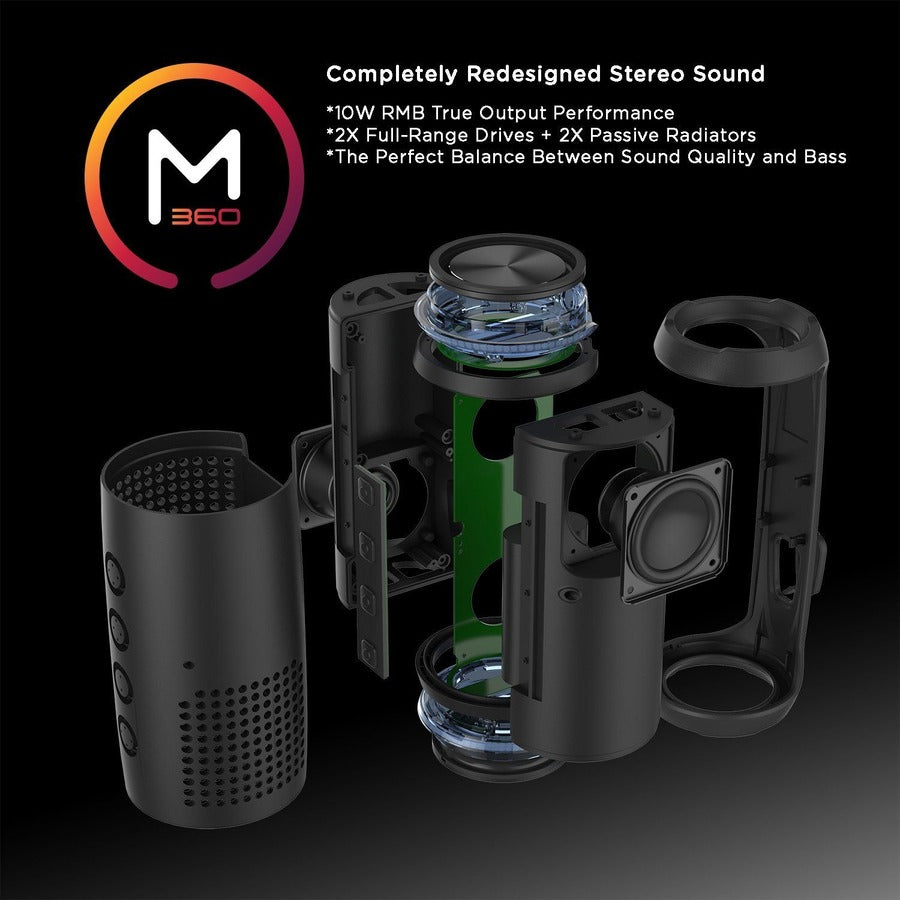 Our Morpheus 360° Sound Ring II Wireless Portable Speakers were built on the Bluetooth® platform, allowing our Wireless Speaker with Microphone to communicate as Bluetooth® low energy devices, providing a stronger signal for better stability and improved battery life. Our speakers feature Immersive 360° HD Sound - as we designed our Waterproof Wireless Portable Speaker with Dual Active Drivers and Dual Passive Subwoofers, providing balanced Immersive Audio with Deep Bass and clear mid's and high's. 25 Watts Loud, with each active driver delivering 12.5 watts each, positioned optimally on opposite sides of the speaker, creating a natural separation that delivers impressive sound. Our Dual Passive Subwoofers are positioned on the ends of the speaker and are 100% focused on producing Deep Rich Bass. Our Digital Signal Processor ties it all together seamlessly...with an advanced Chipset that provides a wider soundstage with 3D movement as the music passes back and forth to create immersive depth, while our best-in-class drivers deliver pure clean sound. Engineered with a TWS Chipset that allows Dual Pairing, allowing you to connect two speakers together for 360-degree Surround Sound. Our IPX6 Waterproof Wireless Portable Speakers are impervious to rain and are durable making them perfect for the Outdoors, Biking, Hiking, Camping, Climbing or just lounging around the pool or hot tub. Extended 25 Hour Playtime - Designed to last all day on a single charge, our Bluetooth Portable Speakers play on and on, allowing you to connect to multiple devices such as iPhone, iPad, iPod, Samsung, Android, HP, ASUS, Lenovo, PC, Mac, Tablets and Bluetooth enabled TV's.
