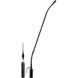 18-inch gooseneck microphone offers interchangeable cartridges and includes a foam windscreen, and a locking flange mount for secure placement. It features high sensitivity and maximum immunity to electromagnetic hum and RF interference.