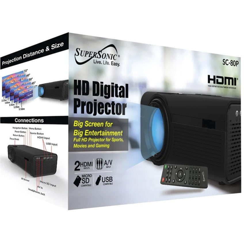 Supersonic SC-80P LCD Projector - 5:3 - Wall Mountable, Ceiling Mountable - Black - 800 x 480 - Front, Ceiling - 480p - 50000 Hour Normal Mode - 2000 lm - HDMI - USB - Gaming, Entertainment - 90 Day Warranty