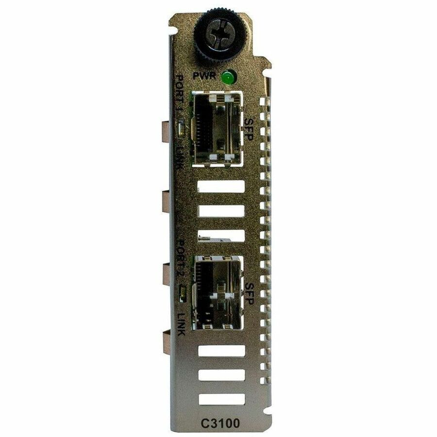The ION C3100 is a fiber to fiber media converter module. It is protocol independent and supports data rates from 100Mbps to 2.5Gbps through two open SFP slots. This any-rate to same-rate converter can be used to perform reliable and cost-effective single mode to multimode fiber conversion or it can be used to provide wavelength conversion in CWDM applications. The ION C3100 is a manageable device when installed in a managed ION chassis.