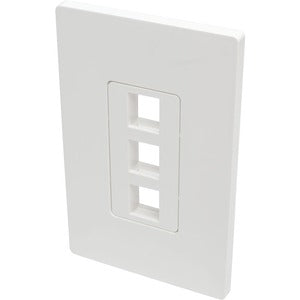 The N080-103 3-Port Single-Gang Universal Keystone Wallplate provides a clean and simple method for connecting audio/video, voice and Ethernet cable lines at the wall. Any type of keystone jack, such as those used in Cat5e/6/6a, USB, HDMI, DisplayPort and RCA applications, snaps easily into the cutouts for quick cable connection. White color blends elegantly into any home or office décor for a sleek, professional installation. Made from high-impact polycarbonate. Fits any mid-sized or standard single-gang box. Includes two mounting screws for easy installation. Compliant with the Federal Trade Agreements Act (TAA) for GSA Schedule purchases.