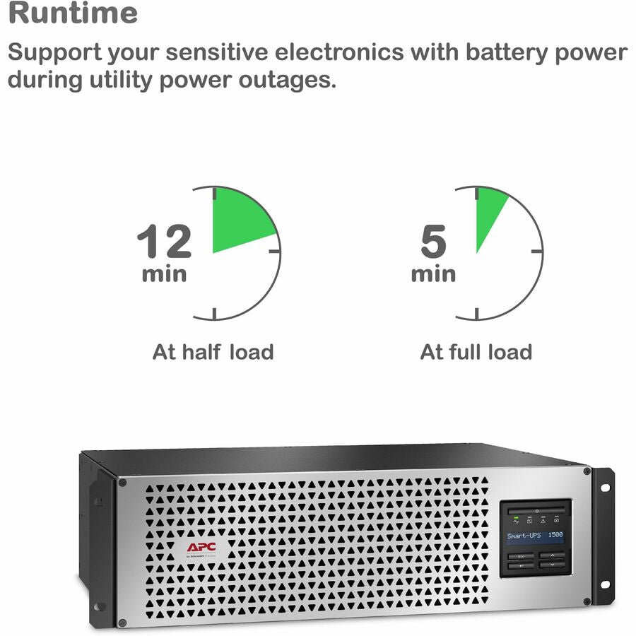This APC Smart-UPS is designed for IT professionals or network administrators to maintain business uptime and continuity. The 1500VA line interactive 3U short depth rackmount UPS provides pure sine wave power to support critical electronics during power disruptions. It comes with NEMA 5-15P input and 6 NEMA 5-15R outlets. It has a preinstalled Network Management Card for UPS network-based monitoring and management. It comes with PowerChute Network Shutdown that provides graceful shutdown of physical servers, virtual machines, and HCI clusters. It offers cloud-based remote power monitoring, UPS firmware upgrades, remote diagnostics and proactive email notifications with recommended actions. The UPS can connect to EcoStruxure IT or third-party centralized management platforms. It provides surge protection against lightning strikes, power sags, brownouts and surges. The SMTL UPS has a 5-year warranty on the UPS and Lithium-ion battery.