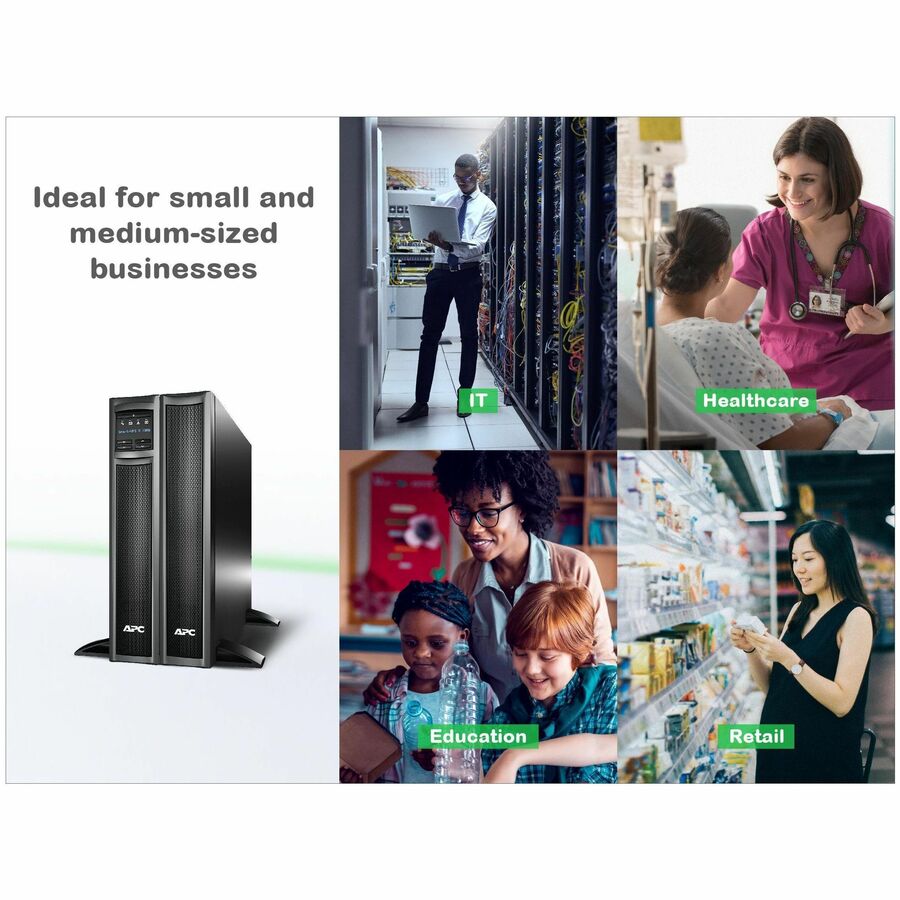 This APC Smart-UPS is designed for IT managers or network administrators to maintain business uptime, data transfer and continuity during prolonged power outages. The 1000VA line interactive 2U rack/tower UPS provides pure sine wave power to support critical electronics during power disruptions. The SMX comes with NEMA 5-15P input and 8x NEMA 5-15R outlets. The UPS has a preinstalled Network Management Card for UPS network-based monitoring and management. The Smart-UPS comes with PowerChute Network Shutdown that provides graceful shutdown of physical servers, virtual machines, and HCI clusters. The UPS offers cloud-based remote power monitoring, UPS firmware upgrades, remote diagnostics and proactive email notifications with recommended actions. This uninterrupted power supply can connect to EcoStruxure IT or third-party centralized management platforms. The SMX UPS has a 3-year warranty, and the built-in lead-acid battery has a 2-year warranty. This is compatible with dedicated user-replaceable battery, and the APC replacement battery cartridge helps restore UPS performance to the original specifications. The Smart-UPS comes with a pair of tower-mounting stabilizing feet and rack-mounting brackets. It comes with APC temperature sensor AP9335T for monitoring temperature. The 2 switchable outlet groups allow more granular management of the power supplied to your devices. The Emergency Power Off feature enables the UPS to remotely shutdown during emergencies.