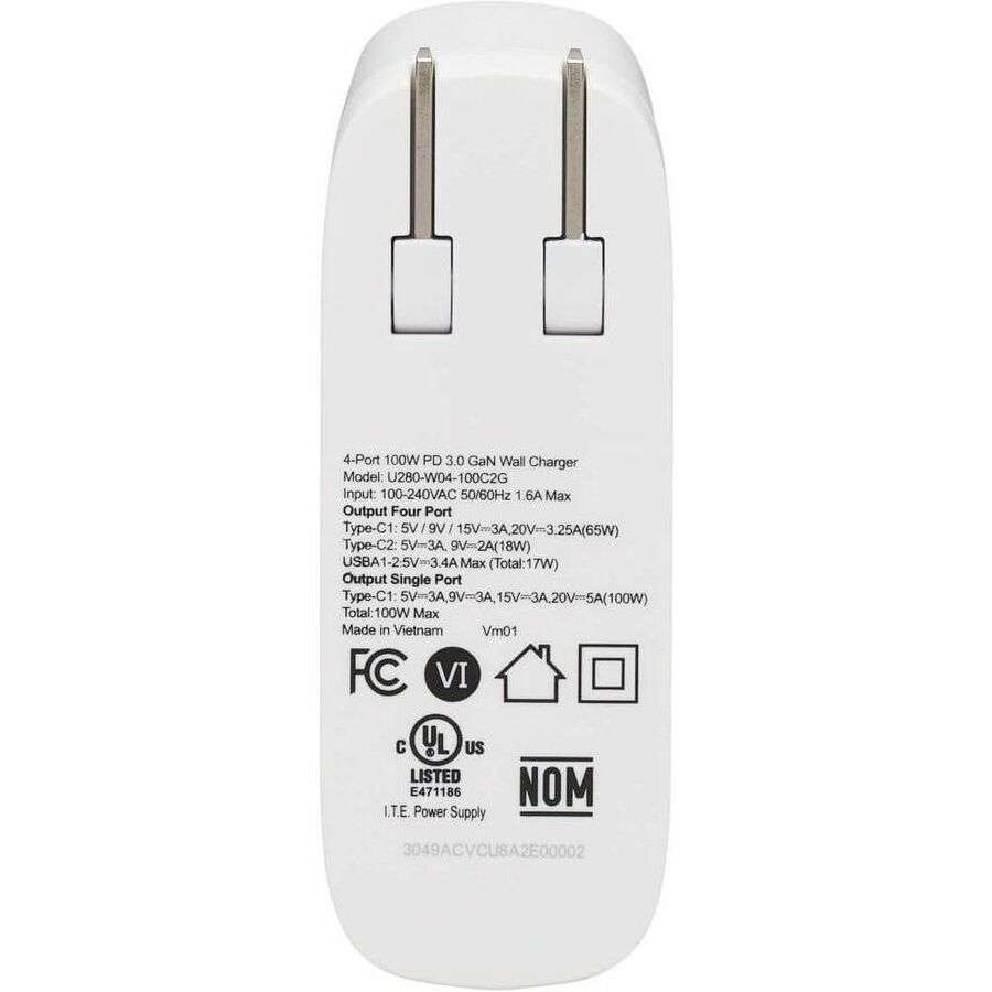 This USB charger features two USB-C and two USB-A ports for quickly and safely charging your mobile devices. Plug the U280-W04-100C2G into any NEMA 1-15R, NEMA 5-15R or NEMA 5-15/20R AC outlet to ensure your laptop, smartphone, tablet and other USB devices charge at their fastest possible speed. The compact unit supports up to 100W for charging when all four ports are being used simultaneously.