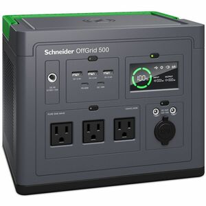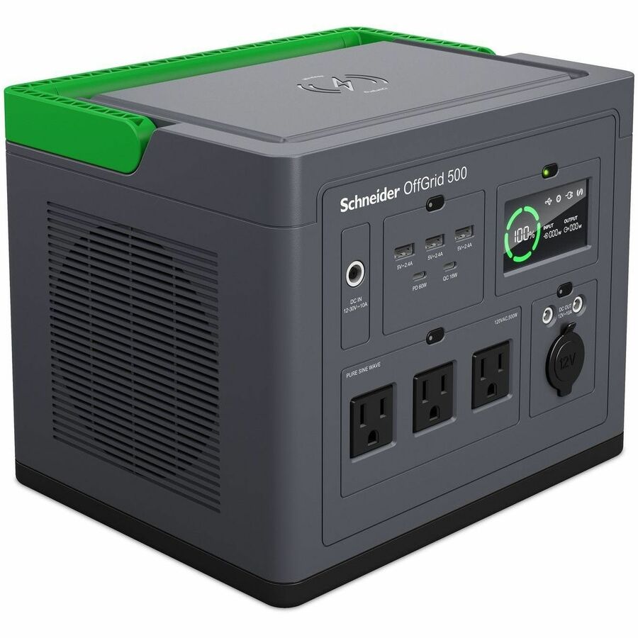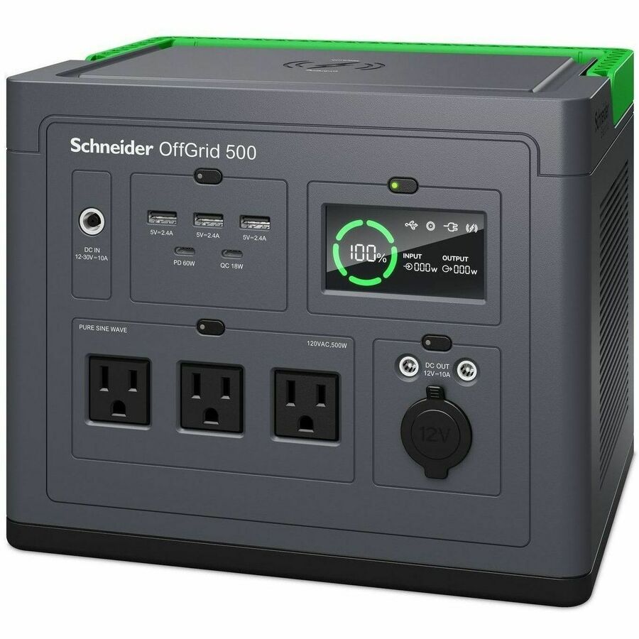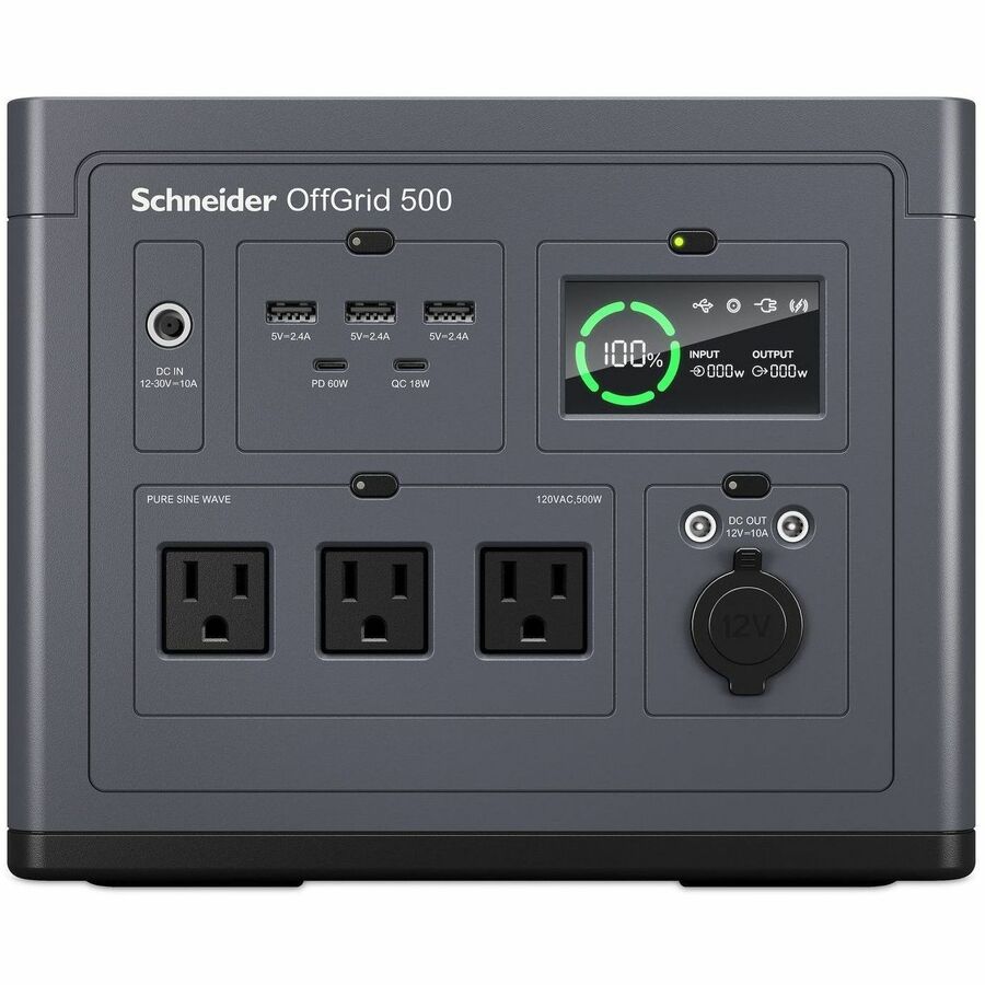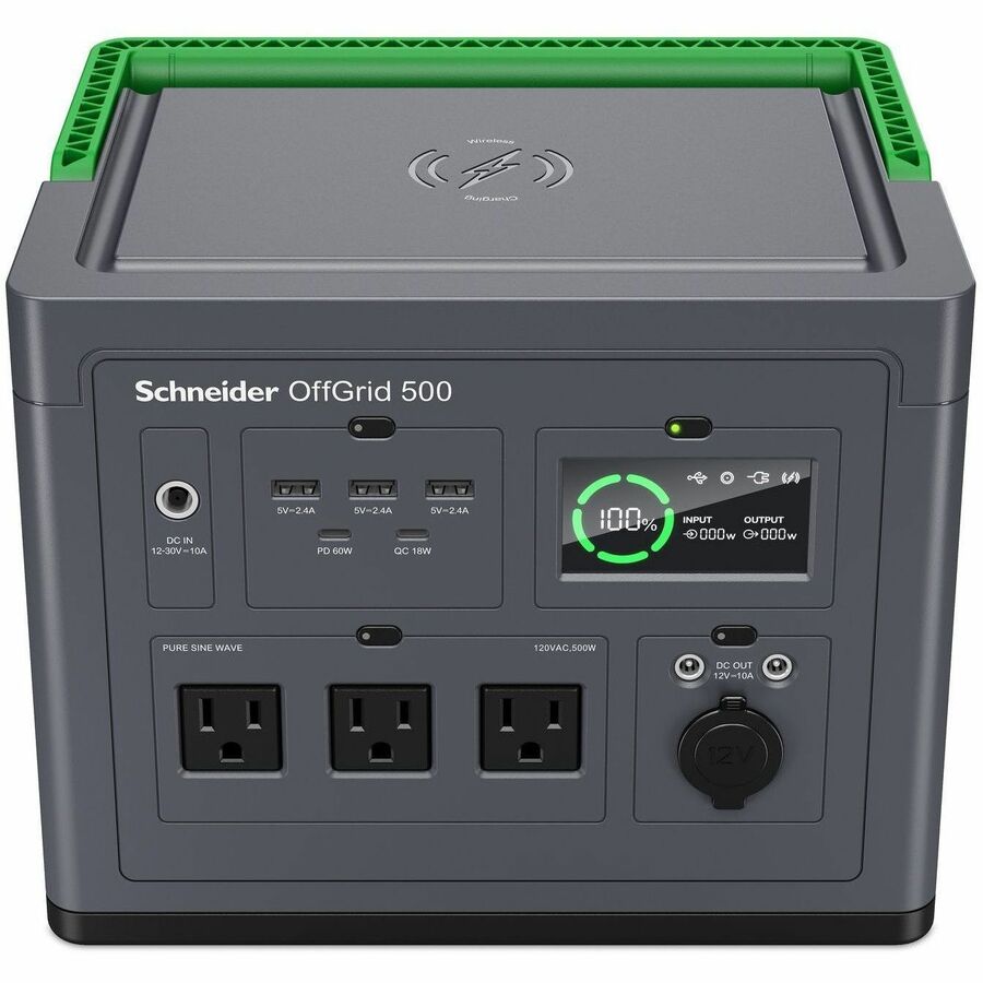 Schneider OffGrid Portable Power Station 500, 120V, 517Wh Lithium-ion, LCD, 3 NEMA, Sinewave, 3 USB-A, 2 USB-C, Wireless Charger