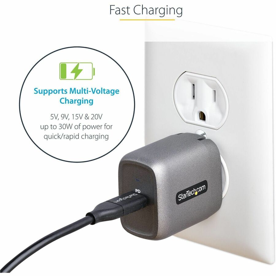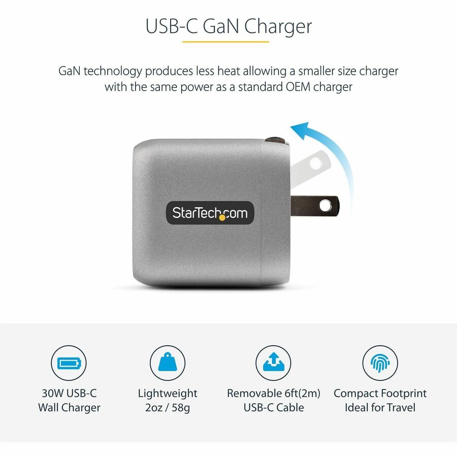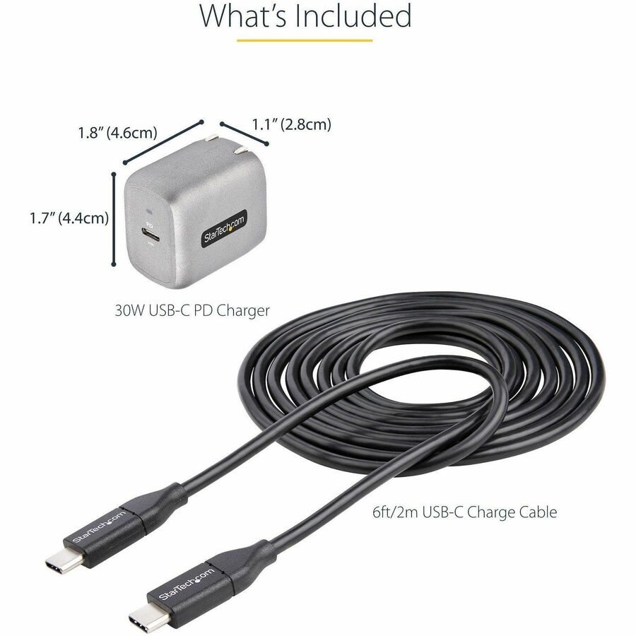 StarTech.com 30W USB-C Wall Charger, Portable GaN Charger w/ USB Power Delivery Fast Charging, USB-IF Certified, 6ft Cable, USB-C Charger