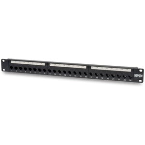 Tripp Lites 24-Port Cat6 Feed-Through patch panel provides patching without punching down bulk wire to the back of the panel. Fully meets or exceeds Cat6 specifications - works with USOC, T568A, and T568B wiring. 19" width mounts easily in 2-Post Relay Rack, or a Wall-Mount Hinged Rack. Detachable cable management bar keeps patch cables neat and tidy on the back of the panel. Tripp Lite Lifetime warranty.