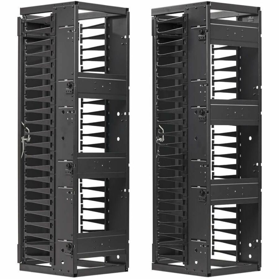 - Vertical fiber cable manager routes and organizes network cabling through your open frame rack while maintaining proper bend radius