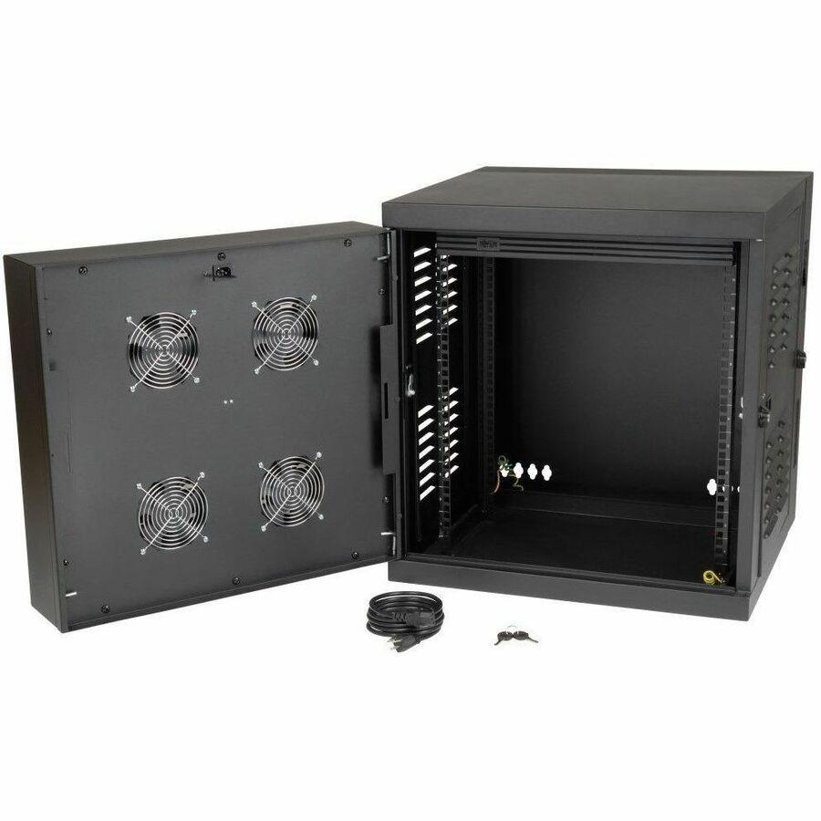 The SRWX12USNEMA has an IP54 (NEMA 12) protection rating, protecting sensitive equipment against dirt, dust, lint, oil, drips and splashes. Its built-in air filters, louvered vents on the front door and side panels, sealed gasket around the door frames and brush strips around cable access points prevent dripping water, oil and airborne contaminants from getting inside. You can replace the air filter with standard, off-the-shelf furnace filters. Four high-performance intake fans built into the front door pull filtered air through the cabinet to keep your equipment cool.