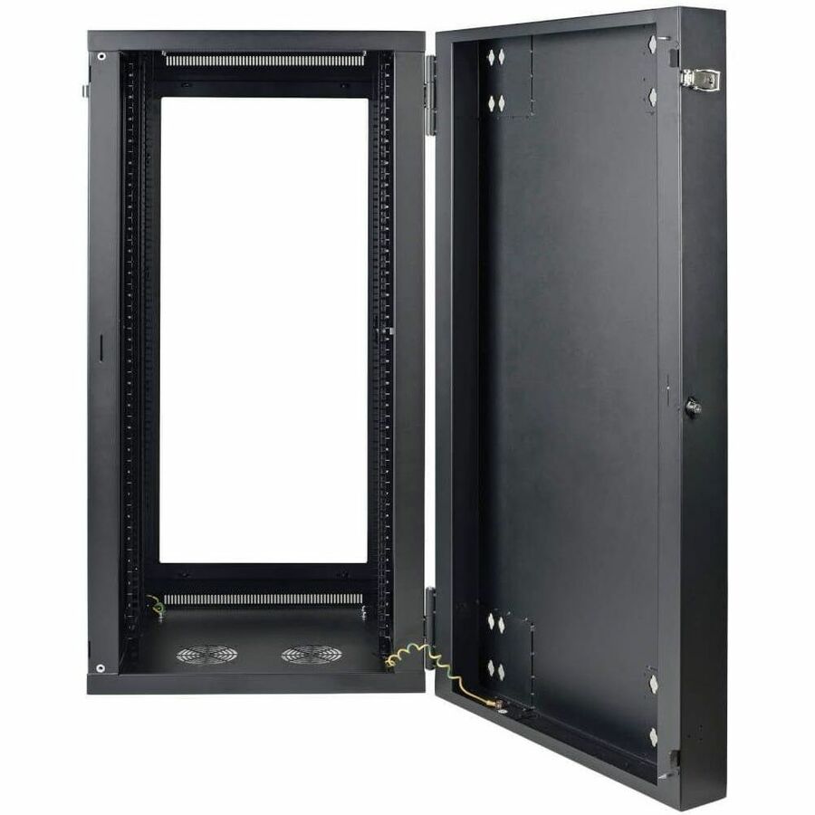 The cabinet swings away from the wall on a sturdy hinge, allowing easy back-door access to equipment and cabling during installation and maintenance. The doors and side panels lock securely to help prevent damage, tampering or theft. The top, bottom and removable side panels are vented, which allows air to flow freely and keep equipment cool. The reversible doors can open left or right by rotating the cabinet 180° before mounting. Convenient top and bottom ports allow easy cable routing.