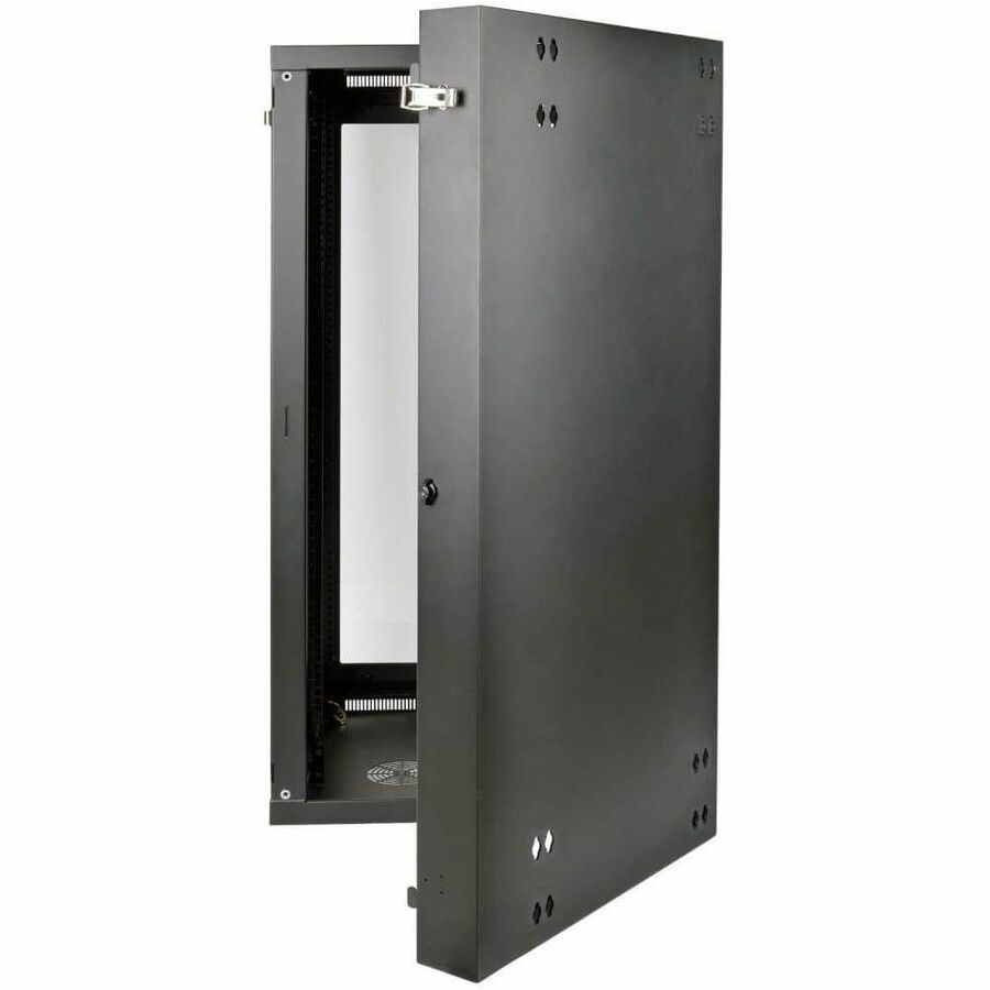 The cabinet swings away from the wall on a sturdy hinge, allowing easy back-door access to equipment and cabling during installation and maintenance. The doors and side panels lock securely to help prevent damage, tampering or theft. The top, bottom and removable side panels are vented, which allows air to flow freely and keep equipment cool. The reversible doors can open left or right by rotating the cabinet 180° before mounting. Convenient top and bottom ports allow easy cable routing.