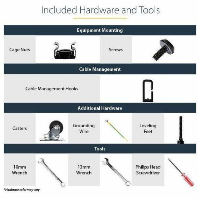 - HARDWARE INCLUDED: Rolling computer/data rack includes cage nuts and screws to mount equipment, easy to read Units (U) and depth adjustment markings, cable management hooks for organization, and required assembly tools