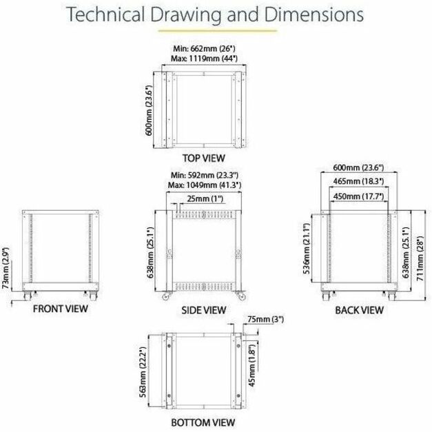 Designed with ease of use in mind, this 12U rack offers easy-to-read markings for both rack units (U) and depth, with a wide range of mounting depth adjustments (22 - 40in) that make it easy to adapt the rack to fit your equipment.