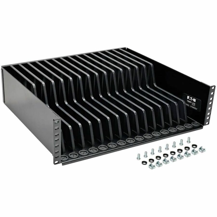 Compatible with all EIA-compliant 19-inch wall-mount and floor rack enclosures, the SR16SHELF is covered in non-scuff paint designed to resist scratches. The devices' charging cables pass through ports with rubber grommets that hold the cable in place and prevent clutter and tangles. All mounting hardware included. Mounts into 3U of rack space, but may require additional rack space depending on the size of the devices being stored.