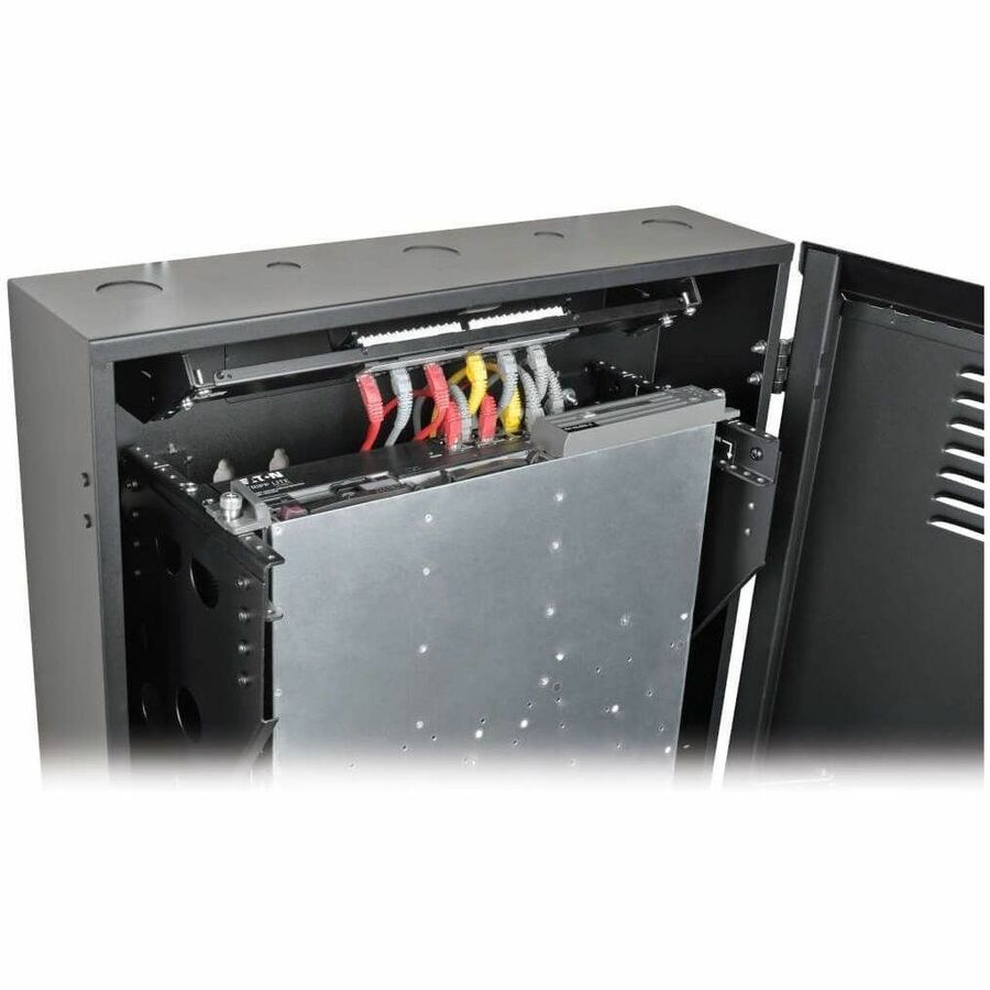 - Low-profile vertical-mount cabinet extends only 8 in. from the wall while housing equipment up to 36 in. deep, including 1U servers, UPS systems, battery packs and switches