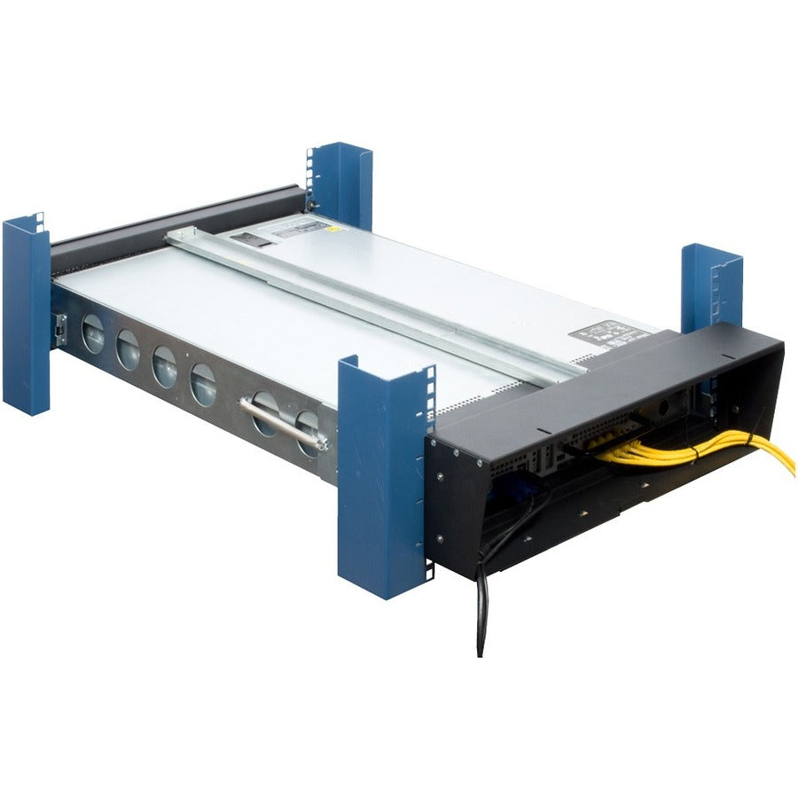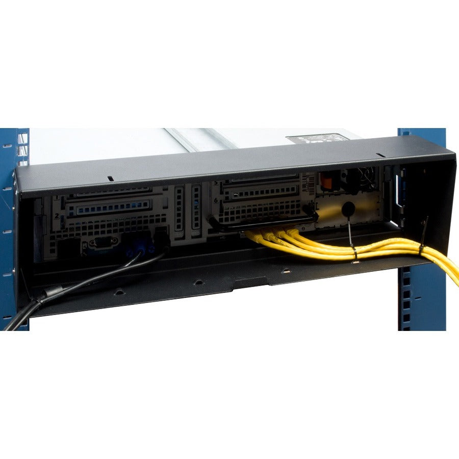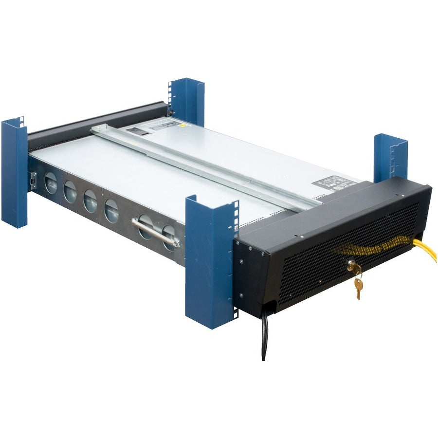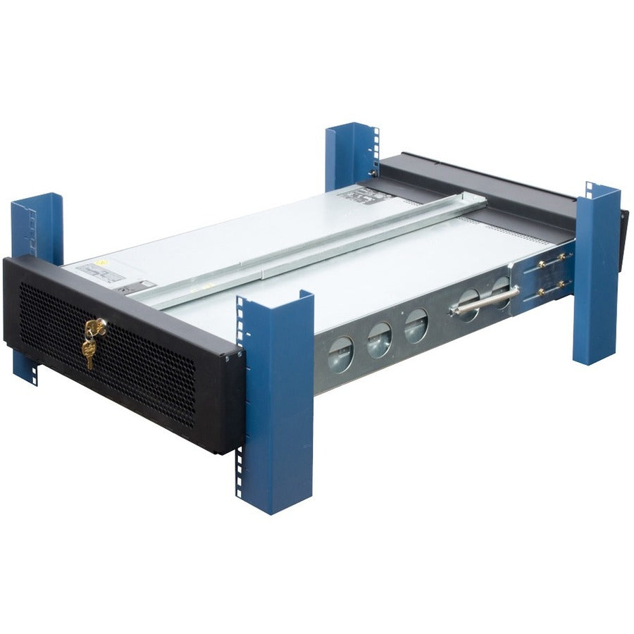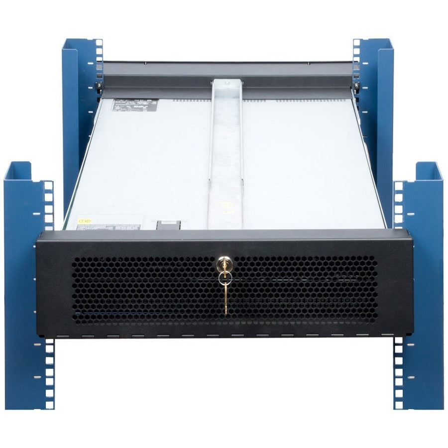 The Secure Server Unit (SSU) from RackSolutions protects a server by locking it in the rack and preventing access to its ports, hard drives, etc. If you have a need to secure a single server within a shared rack, the SSU is the perfect solution. The Secure Server Unit is designed to help provide extra security for sensitive data or to be used as an alternative to a colocation cabinet. The unit includes a front and rear housing which both mount to the rack and are only accessible with a key. An included top, cross bar provides additional security for the server. The SSU is designed to accommodate two, 1U or one, 2U server and uses 3U of rack space.