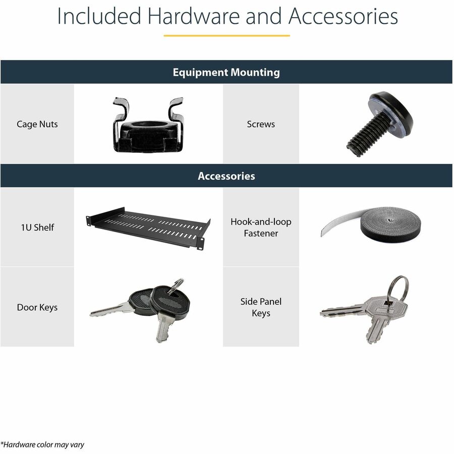 • FULLY ASSEMBLED: Swinging network cabinet ships fully assembled with all of the rack screws and cage nuts required to mount your equipment; Includes a shelf and a roll of hook-and-loop fastener; Wall-mount equipment cabinet is EIA/ECA-310-E Compliant