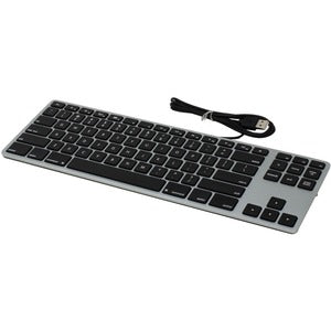 The "Matias Wired Aluminum Tenkeyless Keyboard for Mac - Space Gray" is for people who miss Apple's wired USB keyboard, but also prefer not having a number pad. Many people still like the reliability of a traditional USB 2.0 connection and a two port USB 2.0 hub. This keyboard has a space gray aluminum frame and black keycaps. This keyboard by Matias is just as beautiful as the Apple one was, and has all the special Mac functionality you expect on the function keys. The keyboard has one special function that improves upon the original Apple keyboard ... there is a volume control dial on the top edge of the keyboard that gives you more precision in controlling volume than using the keys; however, if you are a traditionalist, you can still control volume with keys on the Matias keyboard, just like the Apple one.