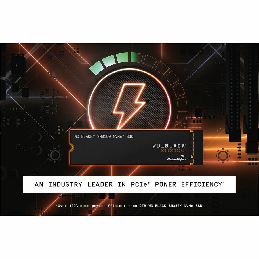 Build your new gaming or workstation system with our cutting-edge PCIe® Gen 5 SSD, delivering blistering speeds up to 14,900 MB/s1 for demanding tasks like high-level gaming, professional content creation, and AI applications. As an industryleader for PCIe® Gen 5 power efficiency, the WD_BLACK™ SN8100 NVMe™ SSD harnesses advanced TLC 3D CBA NAND technology to help ensure performance and reliability, while a low-power profile and optimized thermal performance keep your system cool and running smoothly. With up to 4TB2 of storage and a suite of powerful features, this SSD is the ultimate upgrade for discerning users.