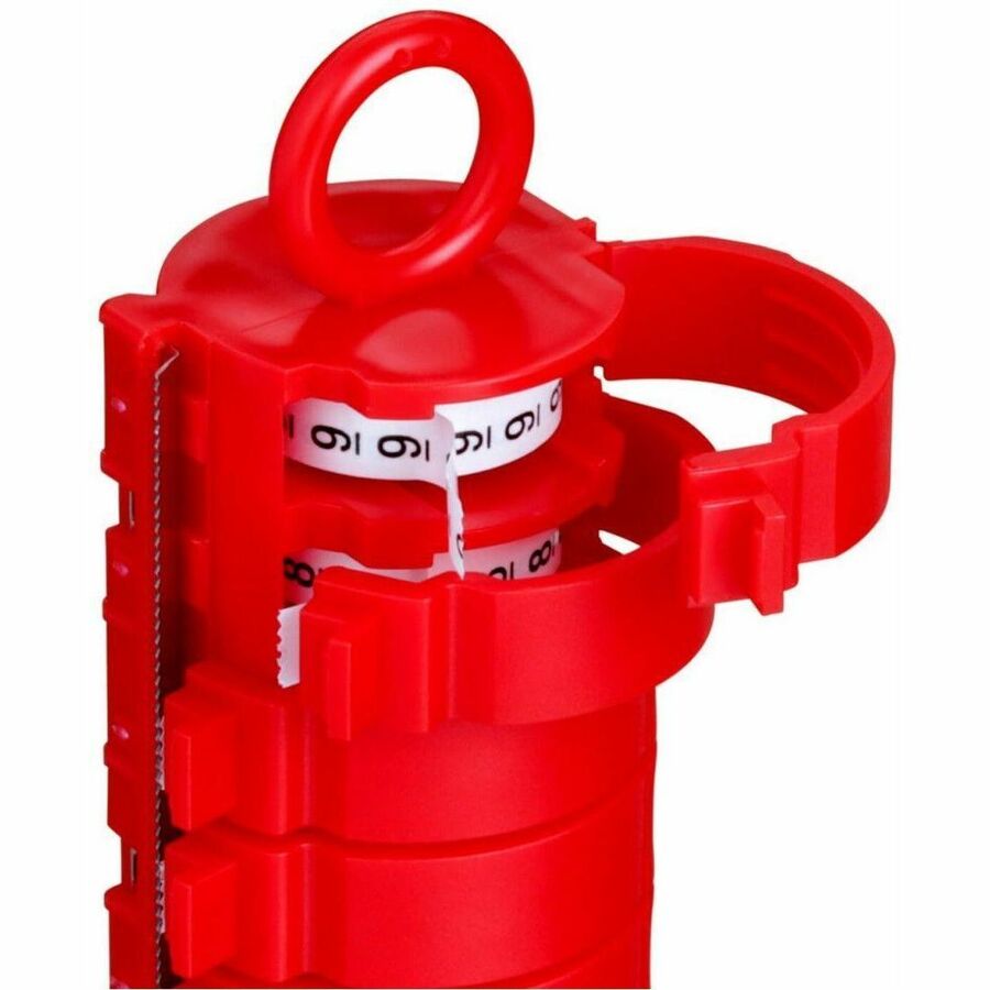 Wire Marker Tape Dispenser with Tape features an end loop that hooks the dispenser easily to a tool pouch or belt. Refillable design holds 10 rolls of 8' long SDR tape with preprinted numbers from zero to 9. Tape with high-tack, acrylic adhesive resists solvents, oil and water, adhering firmly to insulation surfaces. It only dispenses the desired length of tape.