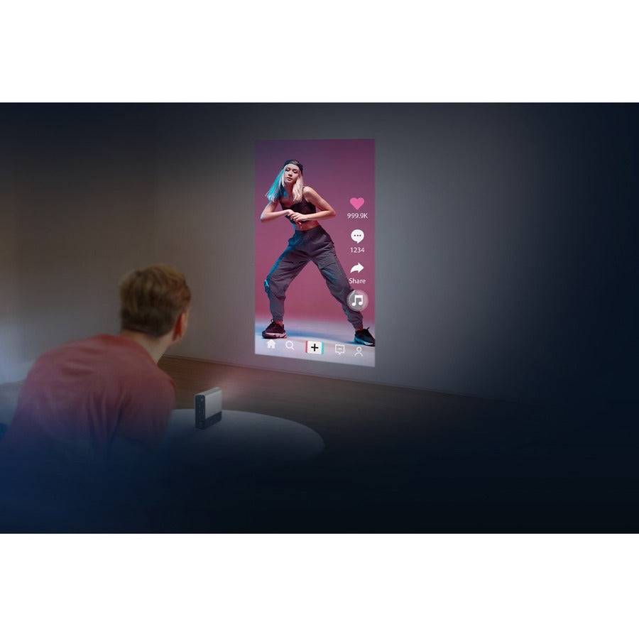 ASUS ZenBeam E2 wireless mini projector redefines portable entertainment. It features an automatic portrait projection* mode that lets users change the projector's orientation while in use so they can easily enjoy social media content and livestreams on a bigger screen. And there's no need to tinker with settings ? because the black sidebars are automatically removed as the projected image smoothly transitions from horizontal to vertical orientation.