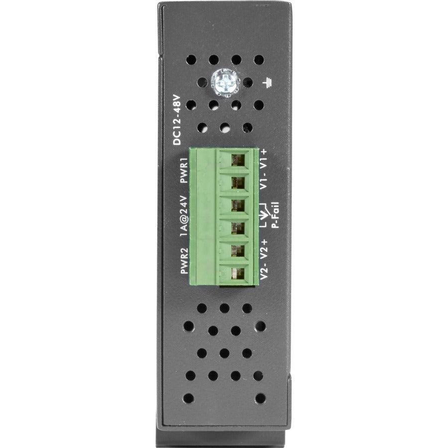 The switch features 12-48 VDC redundant power, which is secured with a double protection mechanism: Power Polarity Reverse Protect and an Overload Current Resettable Fuse. The former tolerates reverse power wiring while the later protects the switch from overload currents.