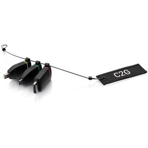The universal cable mount attaches directly to the in-room HDMI display cable, ensuring that the adapters are always within reach. The adapter ring slides to the HDMI connector when needed and out of the way when not in use, reducing strain on the HDMI cable and clutter on the tabletop. The optional stopper fits on HDMI cables from 5mm to 10mm in diameter and prevents the adapters from sliding too far down the cable.