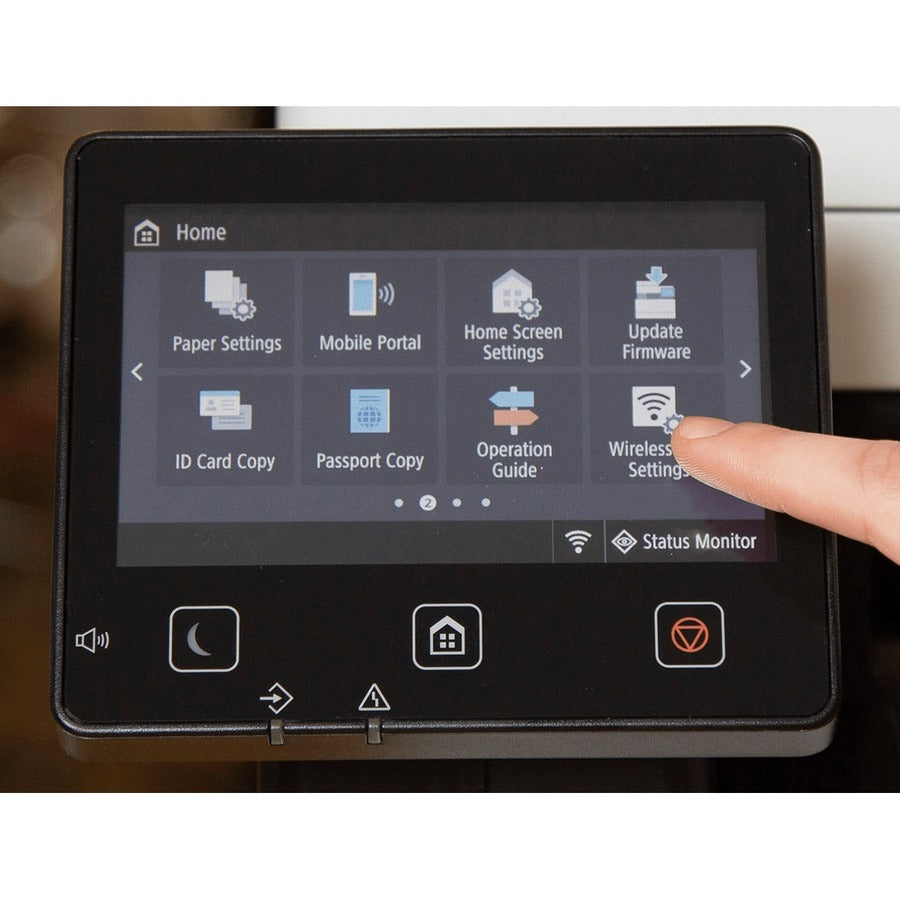 Conveniently print, copy, scan and fax using this compact, Color imageClass MF656Cdw All-in-One Wireless Laser Printer. It prints letter-size documents as fast as 22 ppm. Printer features a 50-sheet automatic document feeder (ADF), 250-sheet input tray and a one-sheet, manual feed slot. Print and copy in resolutions up to 1200 x 1200 dpi and scan up to 600 x 600 dpi. Printer includes automatic, two-sided printing and one-pass, two-sided scanning to increase efficiency. Included toner prints a maximum of 1,350 in black/white and 1,250 in color using Canon Genuine Toner Cartridge 067. Easily set up a wireless connection in four simple steps and print on-the-go with your mobile device using the Canon Print Business app, AirPrint and Mopria. Quickly navigate printer options with the 5" , color, touch-screen LCD. Connect with high-speed 2.0 USB, Ethernet, Wi-Fi or Wi-Fi Direct Connection.