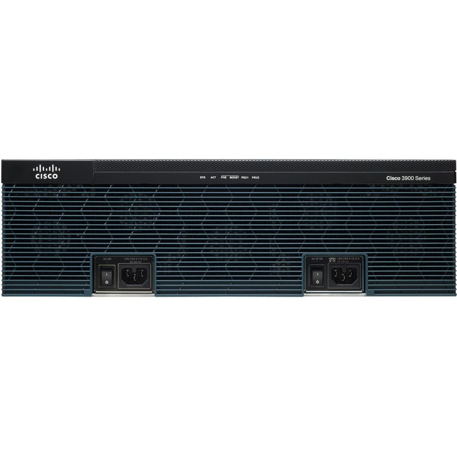 Cisco® 3900 Series Integrated Services Routers build on 25 years of Cisco innovation and product leadership. The new Cisco Integrated Services Routers Generation 2 (ISR G2) platforms are architected to enable the next phase of branch-office evolution, providing rich-media collaboration and virtualization to the branch office while maximizing operational cost savings. The new routers support new high-capacity digital signal processors (DSPs) for future enhanced video capabilities, high-powered service modules with improved availability, multicore CPUs, Gigabit Ethernet switching with Cisco Enhanced Power over Ethernet (ePoE), and new energy visibility and control capabilities while enhancing overall system performance. Additionally, a new Cisco IOS® Software Universal image and Cisco Services Ready Engine (SRE) module enable you to decouple the deployment of hardware and software, providing a flexible technology foundation that can quickly adapt to evolving network requirements. Overall, the Cisco 3900 Series offers exceptional total cost of ownership (TCO) savings and network agility through the intelligent integration of market-leading security, unified communications, wireless, and application services.