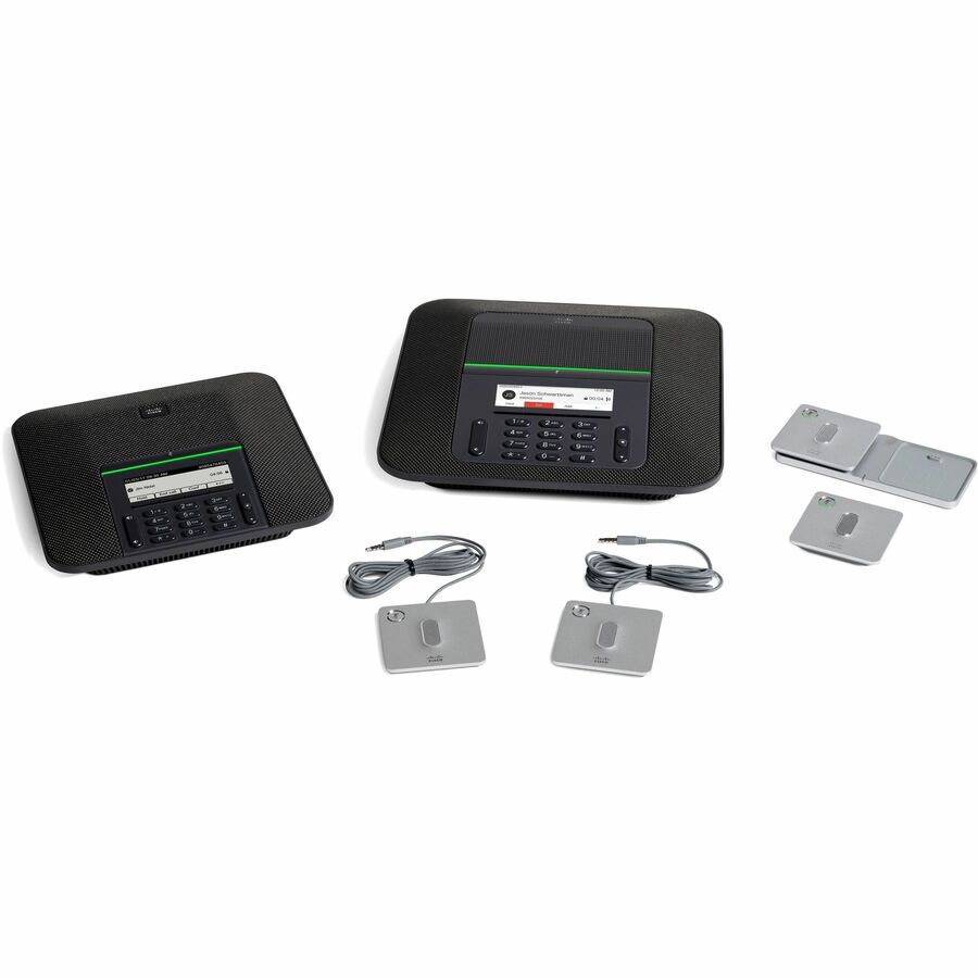 The Cisco IP Conference Phone 8832 provides a simple, flexible, scalable solution that meets the challenges of the most diverse rooms. With the base unit alone, it provides 360-degree coverage for any 20x20-foot room and up to 10 participants. With the optional wired extension microphone kit, it covers any 20x34-foot room and up to 22 participants. With the optional wireless extension microphone kit (using Digital Enhanced Cordless Telecommunications [DECT] technology), it covers any 20x40-foot room and up to 26 participants. With a daisy-chain configuration of two 8832 units along with the optional wireless extension microphone kit, it covers up to a 20x57-foot room and up to 42 participants. It is ideal for executive offices, conference rooms, and boardrooms.