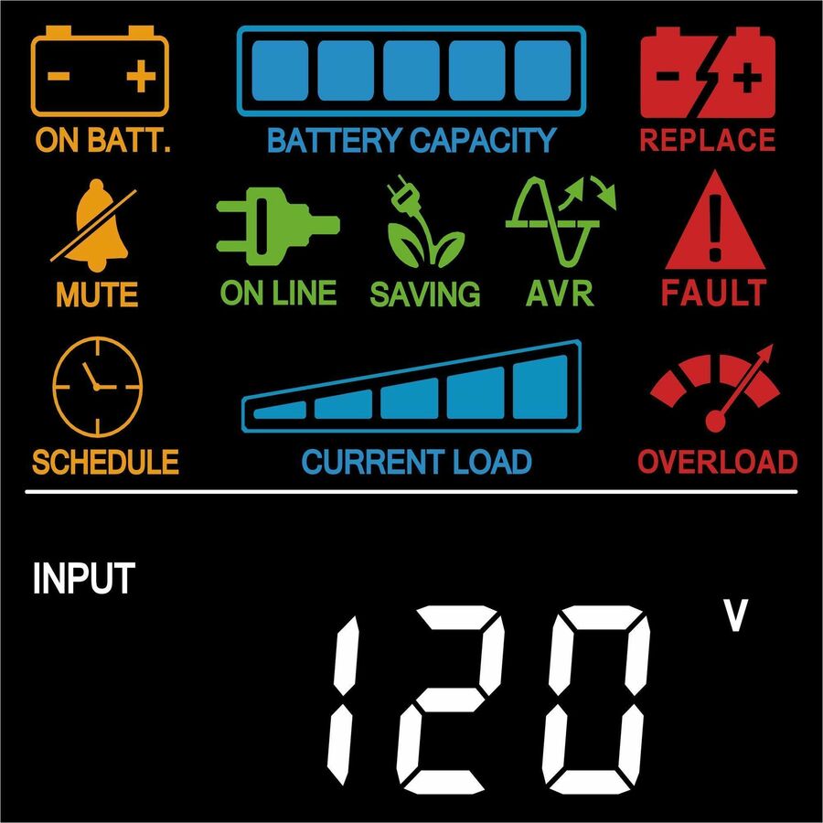 The CP1350PFCLCD features an advanced multifunction control panel with a color LCD to quickly confirm status and alerts at-a-glance. The screen tilts for easy viewing when the UPS is placed in a low position such as under a desk.