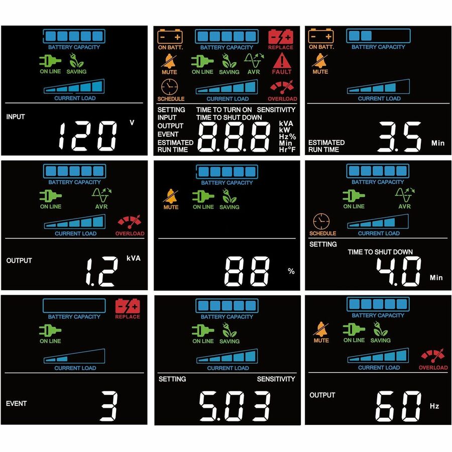 The CP1500PFCLCDTAA features an advanced multifunction control panel with a color LCD to quickly confirm status and alerts at-a-glance. The screen tilts for easy viewing when the UPS is placed in a low position such as under a desk. Two USB charge ports (one Type-A and one Type-C) power portable devices such as mobile phones and tablets, even during a utility power failure.