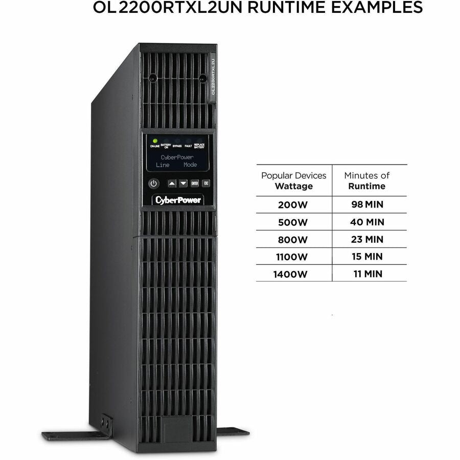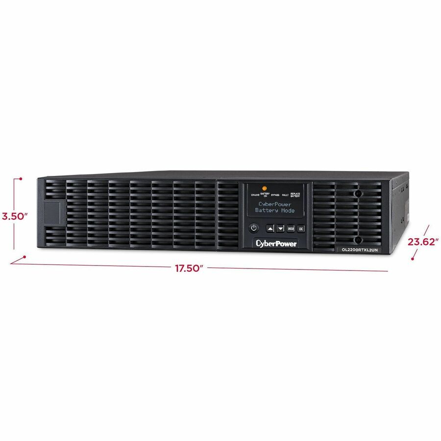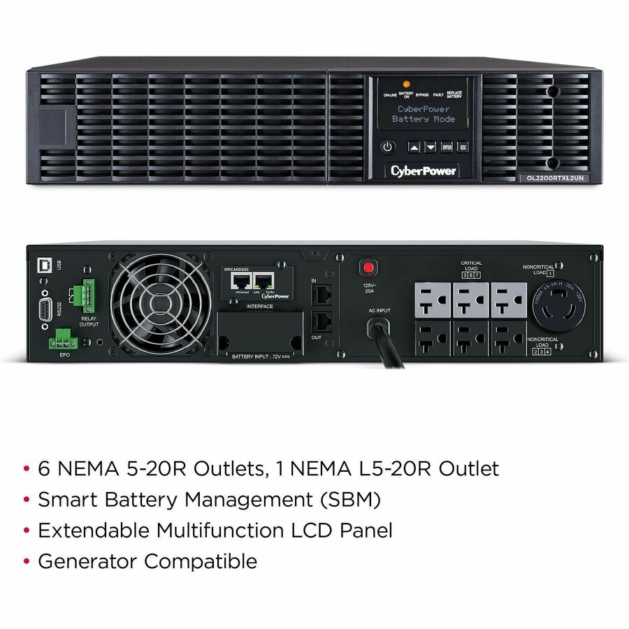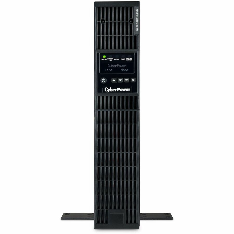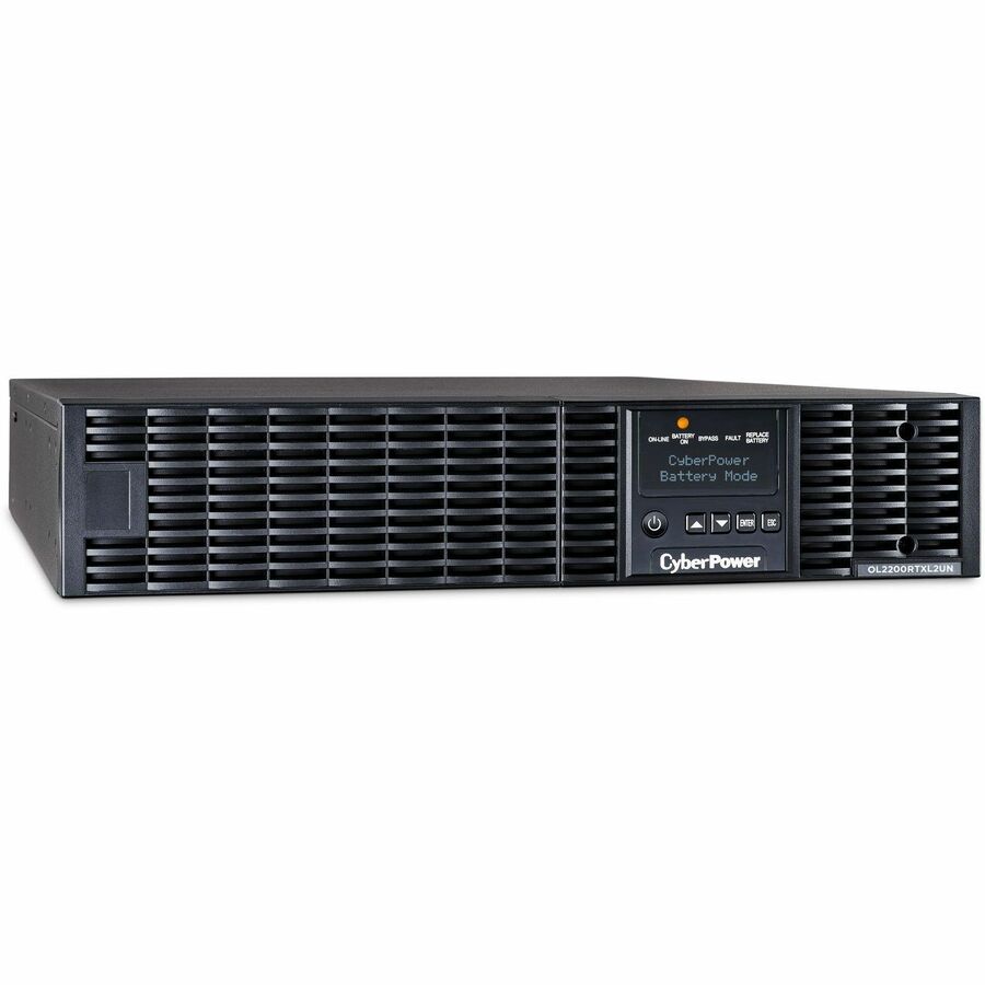 The CyberPower OL2200RTXL2UN is a rack/tower UPS with double conversion topology. It provides sine wave output to critical applications and equipment that require seamless power correction. The Extended Battery Module (EBM) expands runtime, and Fast Charge Technology restores full backup power faster. This model comes with an extendable LCD control panel, Smart Battery Management charging technology, and energy-saving GreenPower UPS™ ECO Mode.