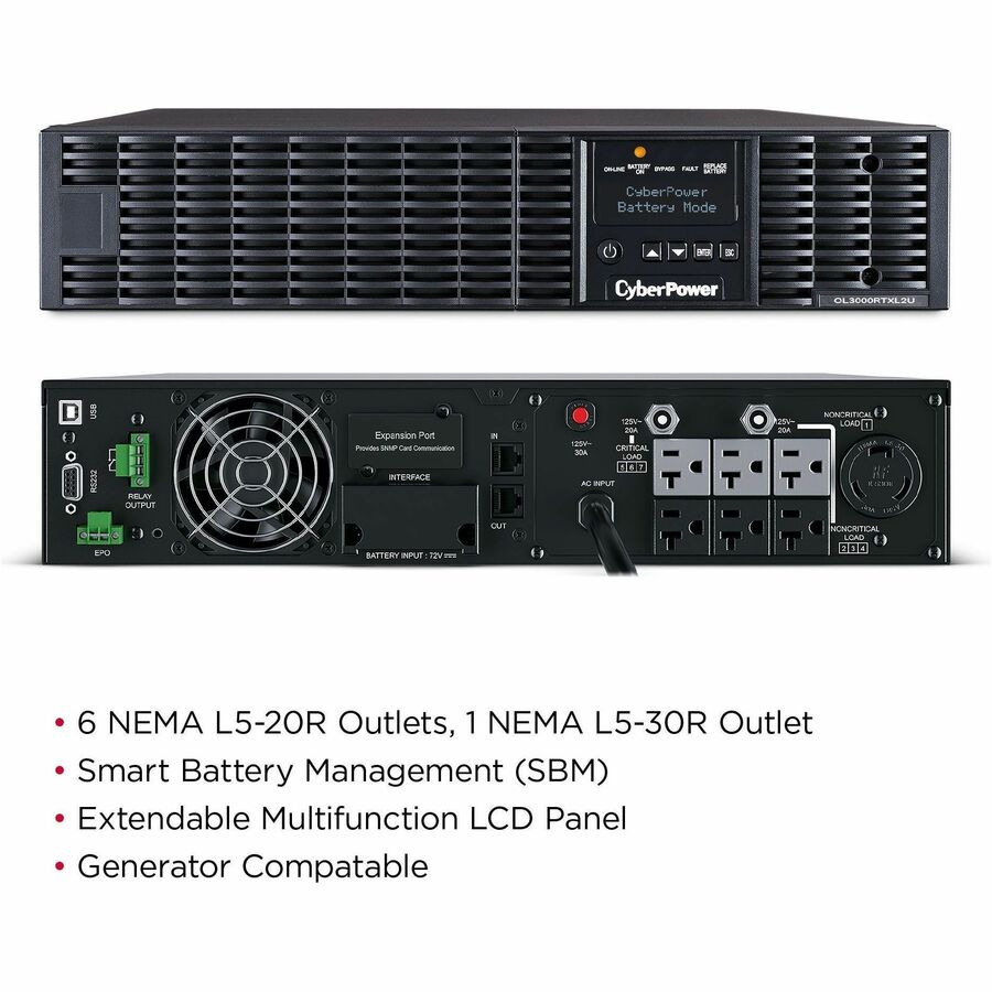 The CyberPower OL3000RTXL2U is a rack/tower UPS with double conversion topology. It provides sine wave output to critical applications and equipment that require seamless power correction. The Extended Battery Module (EBM) expands runtime, and Fast Charge Technology restores full backup power faster. This model comes with an extendable LCD control panel, Smart Battery Management charging technology, and energy-saving GreenPower UPS™ ECO Mode.