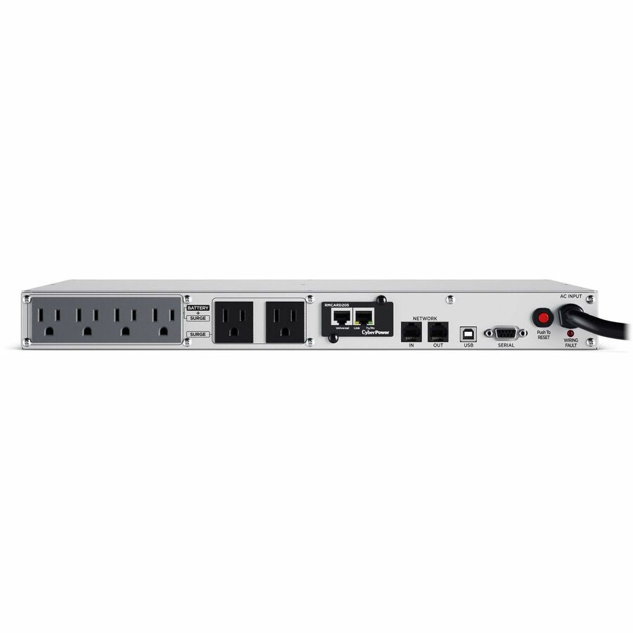 This model accepts the RMCARD205 network management card for remote management and control via a standard web browser or network management system. The OR1500LCDRM1U comes with a three-year warranty and a ,300,000 Connected Equipment Guarantee.