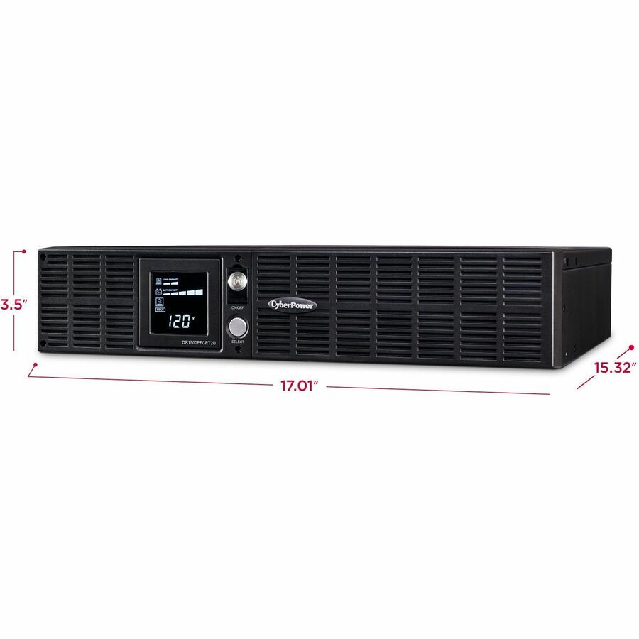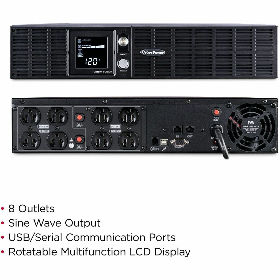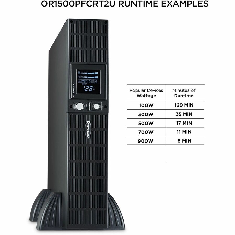 The CyberPower OR1500PFCRT2U PFC Sinewave UPS System with sine wave output and multifunction LCD safeguards networking hardware, networked-based devices, small office servers, workstations and telecom equipment that use conventional and Active Power Factor Correction (PFC) power supplies.