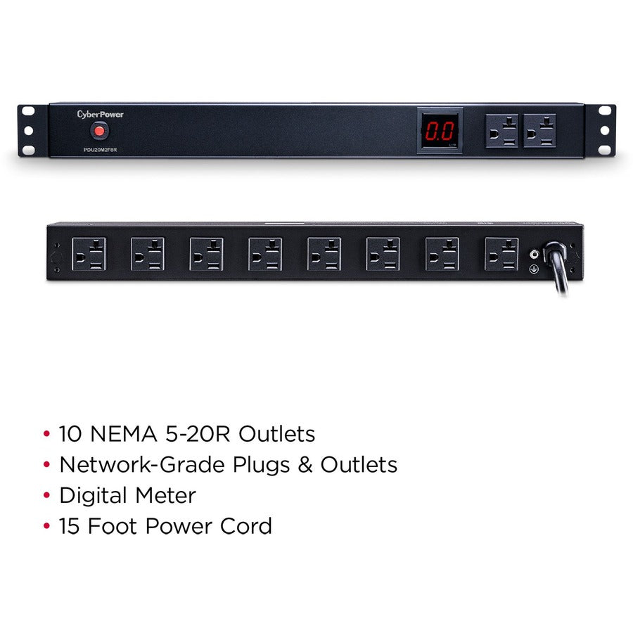 The CyberPower PDU20M2F8R, a 10-outlet (2 front, 8 rear), rackmount metered power distribution unit (PDU), provides 100 - 125 V 20A output. It distributes power to 10 NEMA 5-20R receptacles from a single NEMA 5-20P input with unfiltered electrical pass-through. The current draw for connected equipment is displayed in amps on the front LCD for real-time load monitoring.