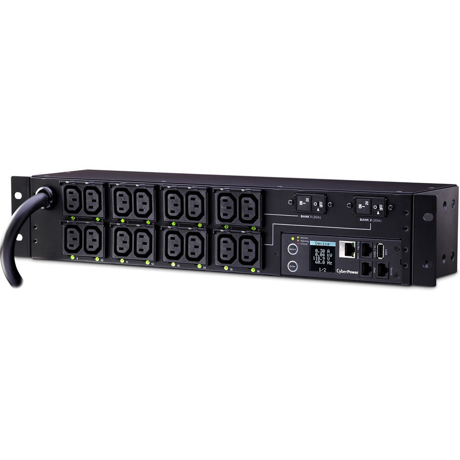 Streamline capacity planning and power management with the CyberPower PDU81007 switched, metered-by-outlet PDU. Ideal for data centers and network closets, this unit provides outlet-level power monitoring in real time, along with individual outlet control for remote reboots, automated load shedding, controlled power-cycling and more. The PDU81007 supports inputs between 200-240V and includes sixteen (16) IEC-320 C13 outlets and a single NEMA L6-30 input power plug. Other features include a rack mount design (2U), built-in web interface (RJ-45 ethernet connection), interactive digital display and power event notifications. The CyberPower PDU81007 is protected by a three-year limited warranty.