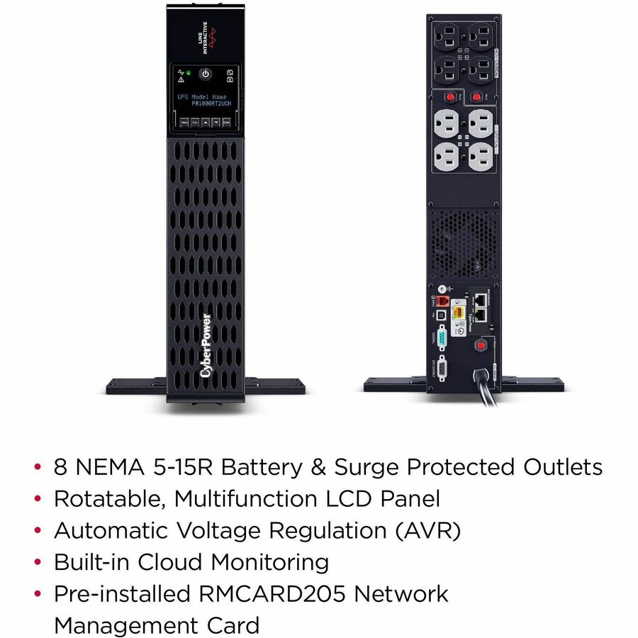 The PR1000RT2UCN is a Smart App Sinewave rack/tower convertible UPS with line-interactive topology, surge protection, and battery backup. CyberPower's Smart App Sinewave series has sine wave output to eliminate power gaps that can be detected by sensitive equipment and cause unexpected shutdowns.