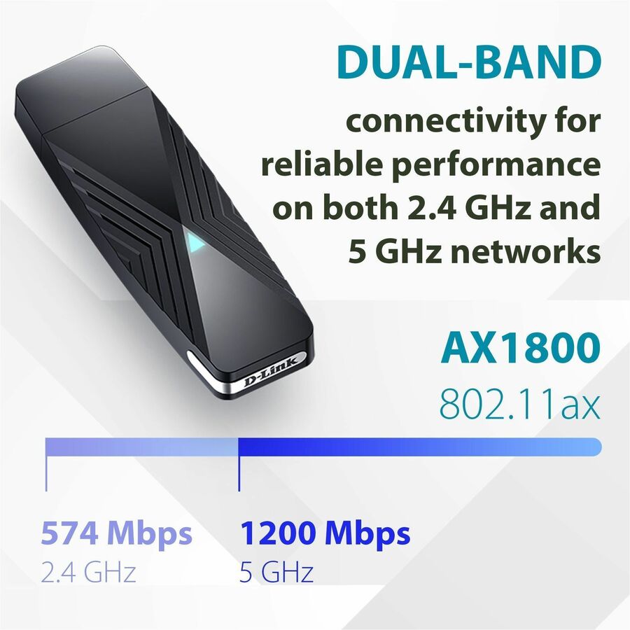 Transform your desktop or laptop's connectivity with the D-Link AX1800 Wi-Fi 6 USB Adapter. Designed to deliver ultra-fast speeds of up to 1200 Mbps on the 5 GHz band and 574 Mbps on the 2.4 GHz band, this adapter offers up to 90% faster speeds on the 2.4 GHz band and 38% faster speeds on the 5 GHz band compared to Wi-Fi 5 for uninterrupted 4K streaming, immersive VR gaming, and lag-free video calls. Featuring advanced technologies like OFDMA and MU-MIMO, it keeps your laptop or PC running smoothly, even in busy networks.