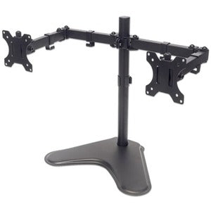LCD-monitor installation above the desk helps maximize the effectiveness of a potential workspace. The Manhattan Universal Dual Monitor Stand with Double-Link Swing Arms improves organization on the desktop, making it easier to get work done on the computer.