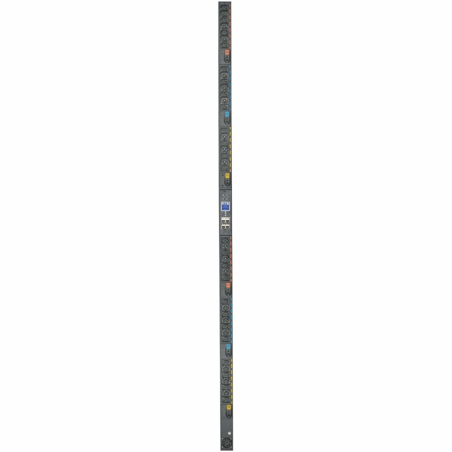 All outlets provide metering and monitoring for granular power data and precision control of power delivery. The outlets are evenly distributed into six color-coded load banks, each with its own circuit breaker, to improve load balancing and organize connections in a crowded rack.