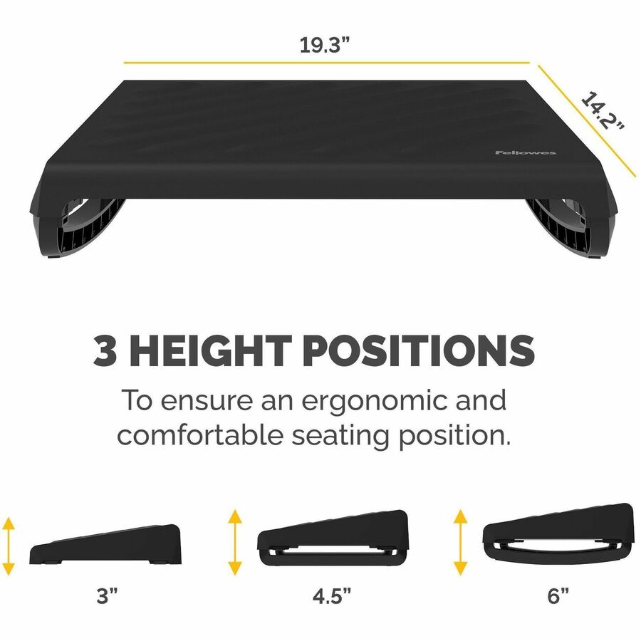 Black. Large platform with 3 height adjustments to ensure ergonomic positioning.