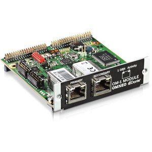 The OM-1 is a compact interface module which is prepared for a connection to an OMNEO network. The OM-1 is able to send and receive Dante audio to and from other PAVIRO Controllers with an OM-1 Interface Module. The transmission of up to 16 digital audio input signals and 16 digital audio output channels with low latency is possible with the OM-1