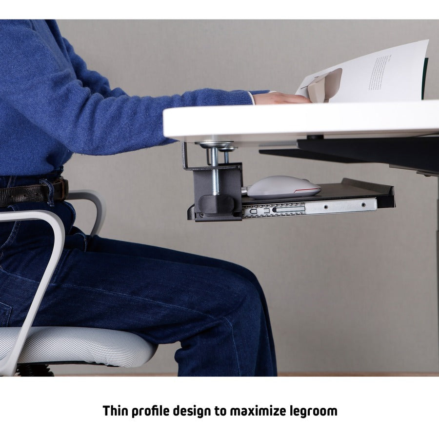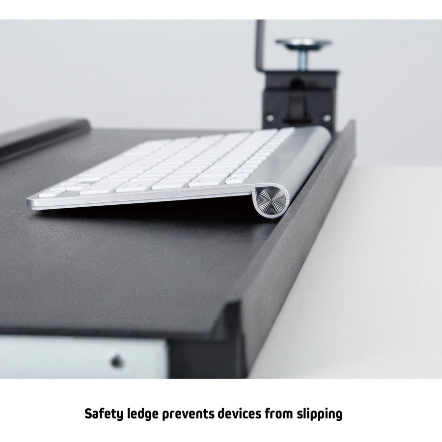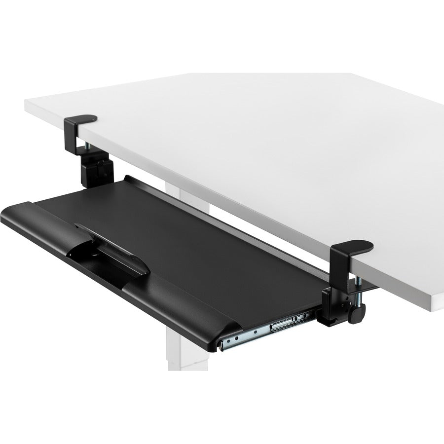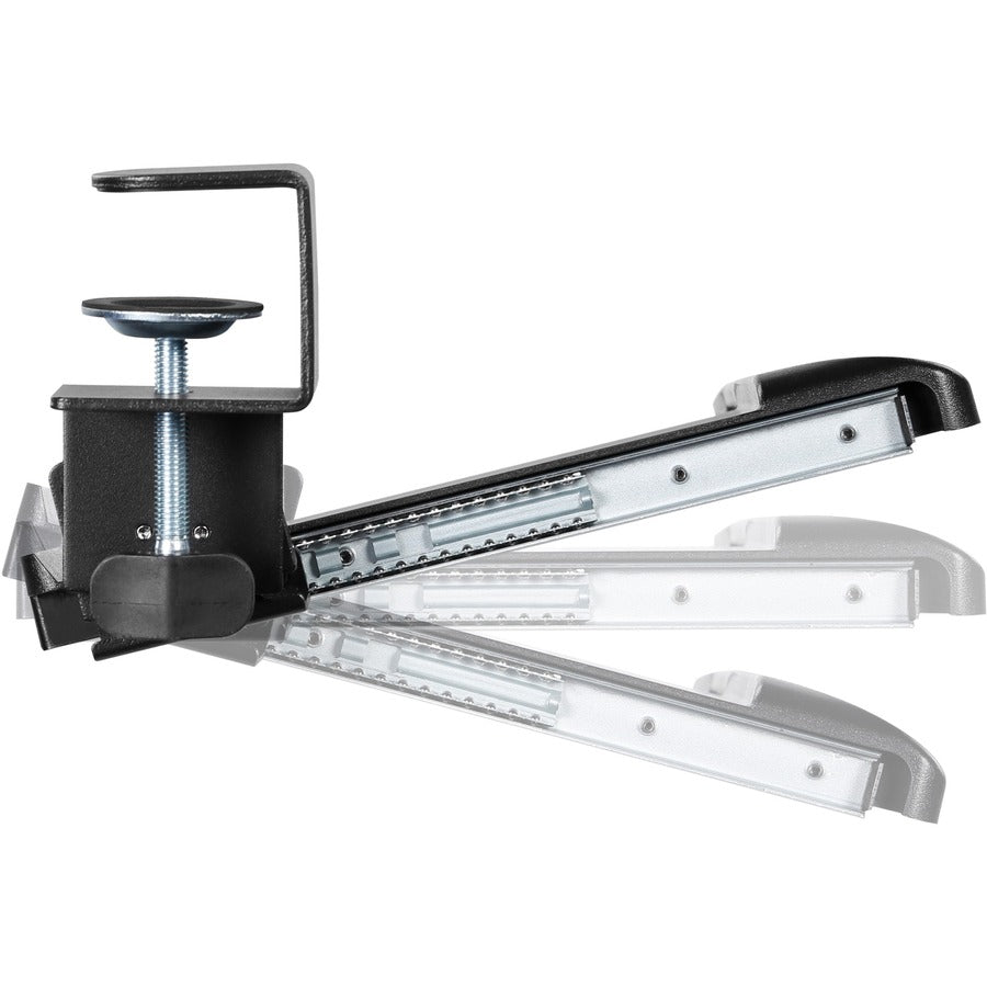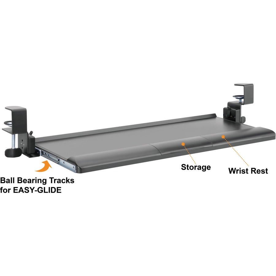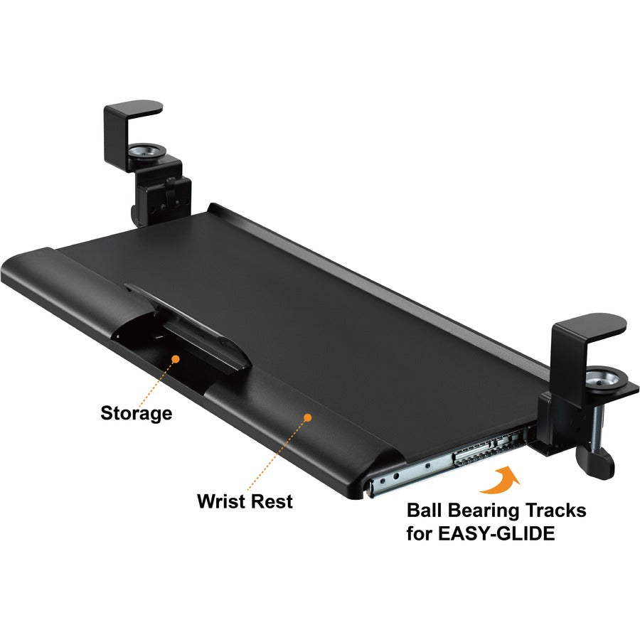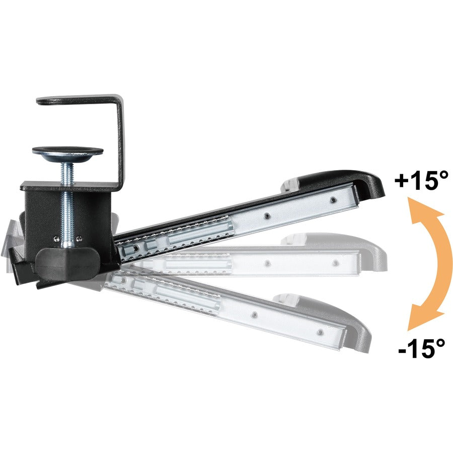 Tilting Keyboard Tray keeps your keyboard at an ergonomically correct height. Tray tilts to a comfortable angle with three settings: negative 15 degrees, 0 degrees or positive 15 degrees. Quality rail mechanism provides smooth sliding from under your desk. Lock tray into place at your selected position or let it slide freely. Easily mount tray to any worksurface. Sturdy, metal clamps fit desks or tables up to 1-5/8" thick.