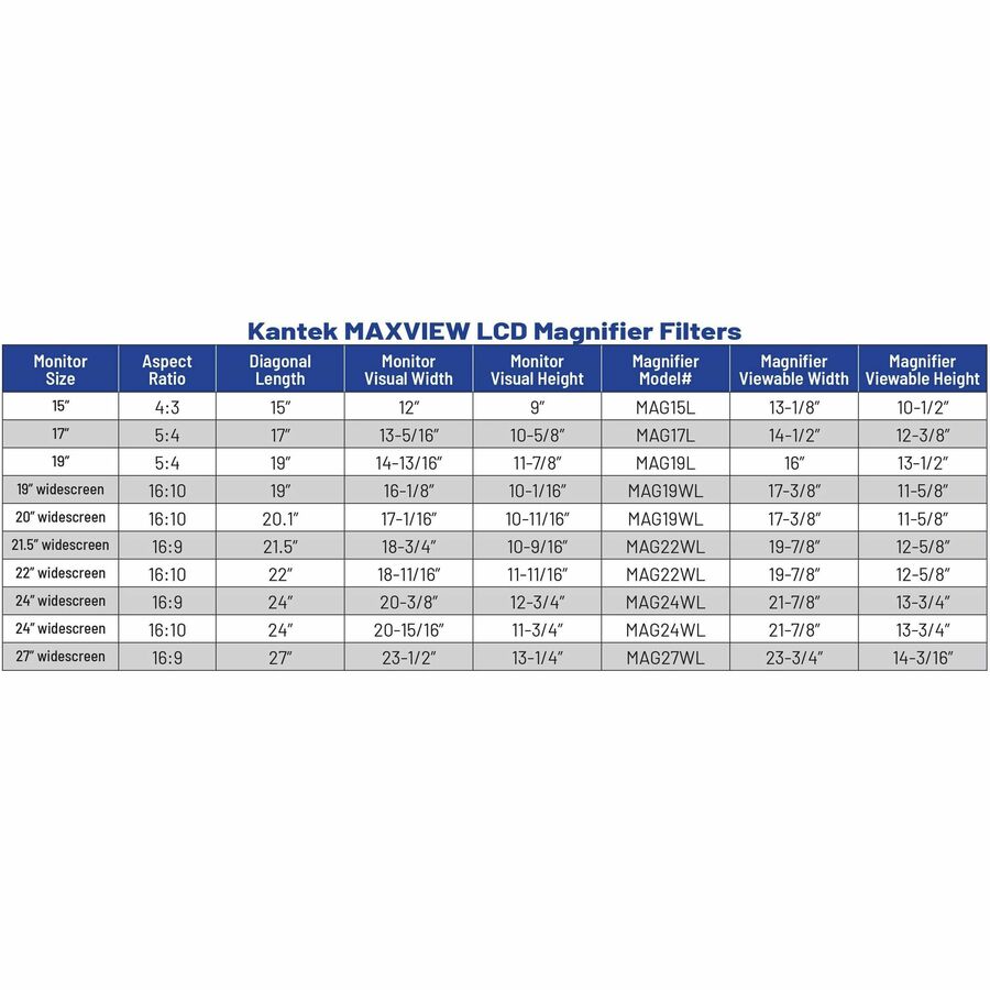 MAXVIEW LCD Monitor Magnifier offers an elegant, lightweight way to make text and images easier to read on your screen. Optical-grade acrylic Fresnel lens increases what's on your LCD monitor up to double in size. Patented design features easy adjustability and a lightweight alternative to conventional heavy glass optical lens. Adjust screen magnification level by moving the magnifier closer or farther from the display - the greater the distance, the larger the image will appear. Light tint enhances the contrast for increased readability. Use fully assembled lens for 27" widescreen LCD monitors for general office use in a normal ambient light environment. It is not suitable for laptops. Lens measures 24.13" wide x 7" deep x 13-75" high.