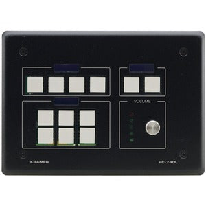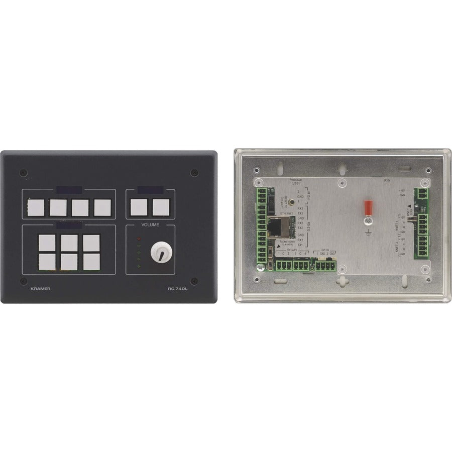 The RC-74DL is a 12-button control keypad, with knob and LCD displays. It is a versatile device that connects to powerful control tools: over Ethernet it connects to Kramer's Site-CTRL™, a remote AV control, site management & monitoring system. For extended controlled device capacity it connects to LAN-connected control gateways. For remote keypad control it connects via KNET™ to master room controllers and auxiliary keypads. It flexibly serves either as a standalone room controller, part of multi-units KNET™ system, or part of multi-unit Ethernet system managed by Kramer Site-CTRL™ site management platform. The RC-74DL is ideal for auditoriums and meeting rooms, for convenient control of their complex multimedia systems and other room facilities such as screens, lighting and shades.