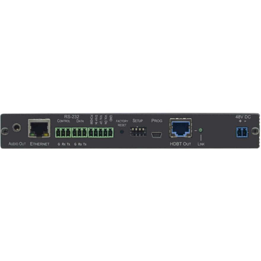 DIP-20 is an extended reach 4K@60Hz (4:2:0), HDBaseT transmitter and Step-in commander for VGA video, HDMI, and unbalanced stereo audio embedding and de-embedding. DIP-20 accepts HDMI and VGA video input, an Ethernet signal, serial data, and an unbalanced stereo audio input (that is embedded into the output signal). It transmits the signal to an HDBaseT (twisted pair) cable to a compatible receiver (for example, the TP-588D or TP-580RXR).