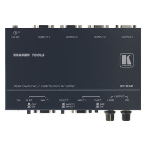 The VP-242 is a high performance switcher for computer graphics video signals with resolutions ranging from VGA through UXGA and higher. It switches one of two inputs simultaneously to four identical outputs.