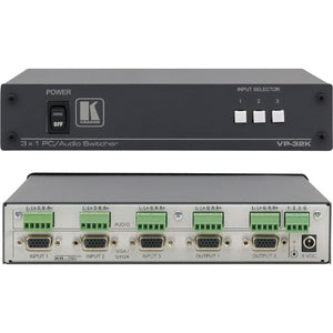 The VP-32K is a high-performance switcher for computer graphics video signals with resolutions up to and exceeding UXGA, and balanced stereo audio. It switches any one of three inputs to two identical outputs.